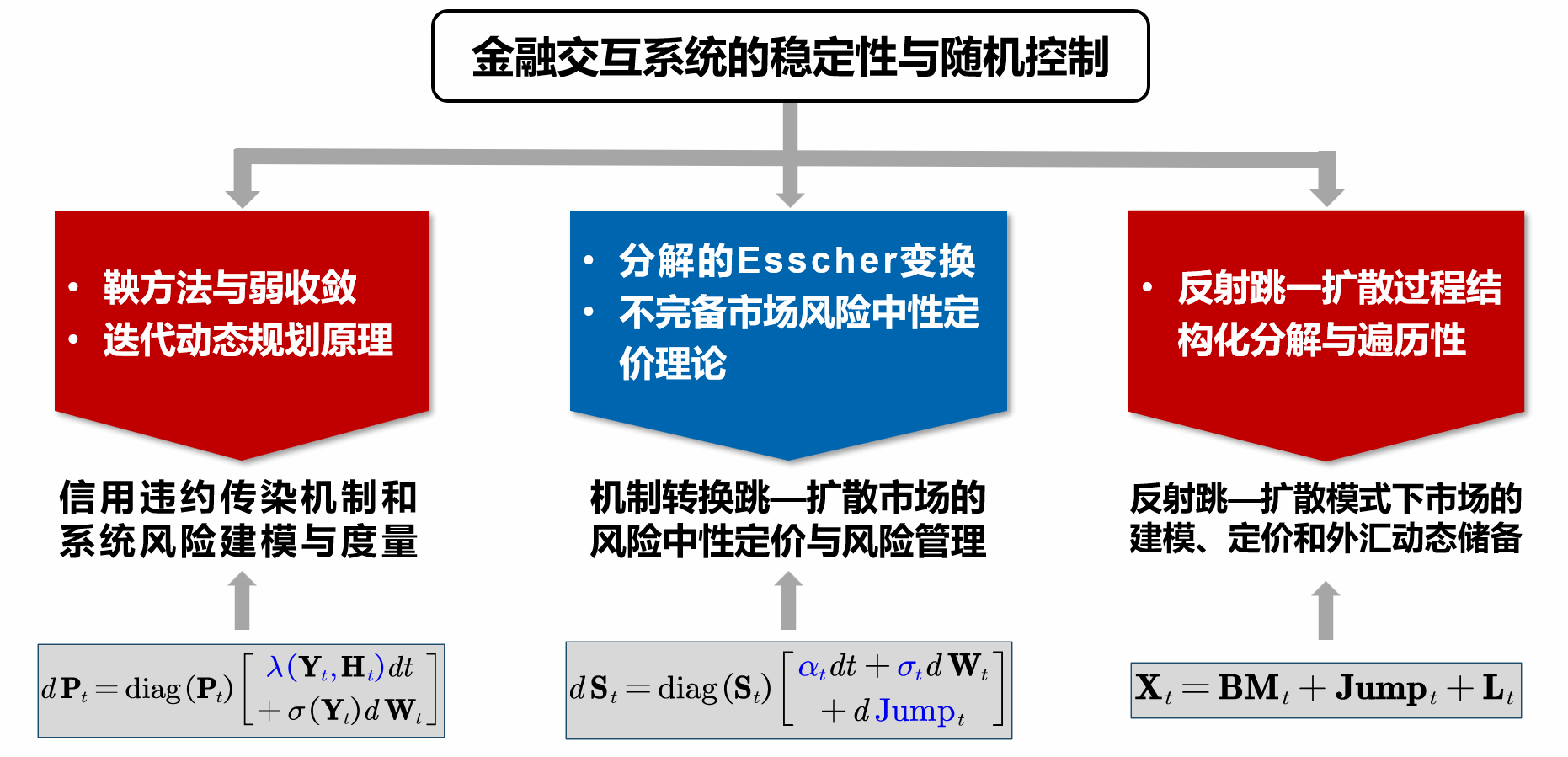 该获奖项目聚焦于金融数学前沿领域,针对不完备金融市场模型开展了系统性研究,并引入了创新的模型框架与概率方法。其主要研究内容包括:一是在一般违约相关条件下,建立了系统性风险的渐进解析定价框架,为信用投资组合的最优投资策略提供了理论基础。二是提出了分解形式的ESSCHER变换,用于识别不完备市场条件下的风险中性定价测度;同时,将动态违约视为机制转换过程,构建了相应的风险控制与投资组合管理分析框架。三是创新性地将机制转换跳-扩散模型引入外汇风险管理领域,首次建立了基于机制转换的金融衍生品定价理论框架,并发展了考虑马氏链主权信用评级影响的利率与外汇升值、波动率的机制转换跳扩散市场模型。该项目在不完备市场建模与理论分析方面取得了创新性突破,相关研究成果在金融系统性风险识别与监控、受控金融市场违约风险评估、信用资产组合管理、金融衍生品定价及保险风险管理等领域具有潜在的应用价值。