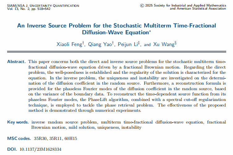 近期,太阳成集团(tyc1286·China)官方网站冯晓莉副教授,研究生姚强和中国科学院数学与系统科学研究院李培军研究员,王旭副研究员合作,在随机微分方程反随机源的理论分析和数值计算方面取得新进展,相关结果发表在美国工业与应用数学学会旗下重要期刊SIAM/ASA Journal on Uncertainty Quantification上 [Xiaoli Feng, Qiang Yao, Peijun Li, Xu Wang, An inverse source problem for the stochastic multi-term time-fractional diffusion-wave equation, SIAM/ASA Journal on Uncertainty Quantification, 13(2), 518-542, 2025]。