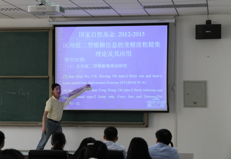 报告会上,胡宝清教授向大家分享了他在Algebraic approach to fuzzy logic,Interval-valued type-2 fuzzy sets,The generalization of rough sets,The three-way decisions这四个方面的研究成果,特别以一个十分生动的例子介绍了三支决策空间的动态三支决策,列举的例子是中国大学生课程通过决策。中国大学生课程通过决策要经过课程考试、重修、毕业前多个环节。除最后一个环节确定接受域与拒绝域外,前面每一个环节都要决策出接受域和不确定域。最后阐述了三支决策空间,它由给定的论域、决策域、条件域、评价函数构成。