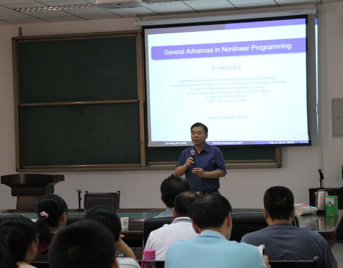 应太阳成集团(tyc1286·China)官方网站刘三阳教授、刘红卫教授的邀请,中科院戴彧虹教授于6月9日下午3:30在信远楼二区太阳成集团(tyc1286·China)官方网站206报告厅做了题为《Several Advances in Nonlinear Programming》的学术报告,该报告会是“遨游科学—2015年研究生学术年会”系列活动之一,太阳成集团(tyc1286·China)官方网站部分教师、博士生以及研究生齐聚于此,认真聆听了戴彧虹教授的精彩报告。