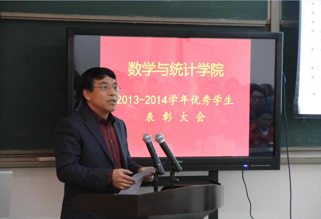 首先,高俊亮书记讲话对受表彰同学表示祝贺,同时就我院2014年的教学、科研、人才培养、学科建设等各方面的亮点工作进行梳理总结。之后房亮老师对我院2013~2014年度的学生工作做了简要汇报并宣读表彰决定。为在大学生中弘扬积极进取、奋发图强的精神,激励大学生刻苦学习、努力成才,营造积极向上的校园文化氛围,促进优良学风建设和大学生综合素质提高,学院设立数学院本科生“学科竞赛奖”和“学业优秀奖”及研究生“学科竞赛奖”和“学术优秀奖”,对2013~2014年度在学科竞赛和学业成绩上取得优异成绩的同学给予表彰奖励。“学科竞赛奖”的表彰对象为获得国家和国际各类学科竞赛获得一等奖或两次二等奖的同学,“学业优秀奖”表彰学业品行端正、成绩优异的本科生,“学术优秀奖”表彰在科学研究中取得突出成绩的研究生,此次大会共表彰本科生“学科竞赛奖”12人、“学业优秀奖”10人、研究生“学科竞赛奖”5人、“学术优秀奖”5人,刘院长和高书记为获奖同学颁发了证书和奖品。此后,国际大学生数学建模竞赛最高奖(Outstanding Winner)得主本科生何睿杰同学,大学生数模竞赛国家一等奖和研究生数模竞赛国家一等奖获得者、研究生期间发表二区SCI论文和多篇EI文章的马锋同学,感谢学院提供了良好的学习条件和氛围,感谢领导和老师们的悉心培养,号召同学们努力学习、戒骄戒躁、不断进取,为美好明天奋斗。最后,刘院长讲话,对受表彰同学表示祝贺,同时强调数学的基础性、工具性和应用的广泛性,以及数学对人逻辑思维的严密性、条理性和综合处理问题能力方面独特的锻炼作用,他勉励大家勤奋是成才的必由之路,只有持之以恒的努力才能获得成功,祝同学们新年快乐并希望同学们在新的一年里学习生活快乐、取得更大成绩。