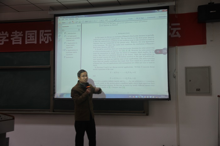 最后,冯育强教授作了题为“producing cones, fixed point theorem and spectral radius of fractional integral operators”的学术报告。冯教授将不动点理论在有序空间上进行推广及论了不动点的存在性和唯一性,然后从对再生锥的刻画出发得到了一些结论和推广,如极值映射等。