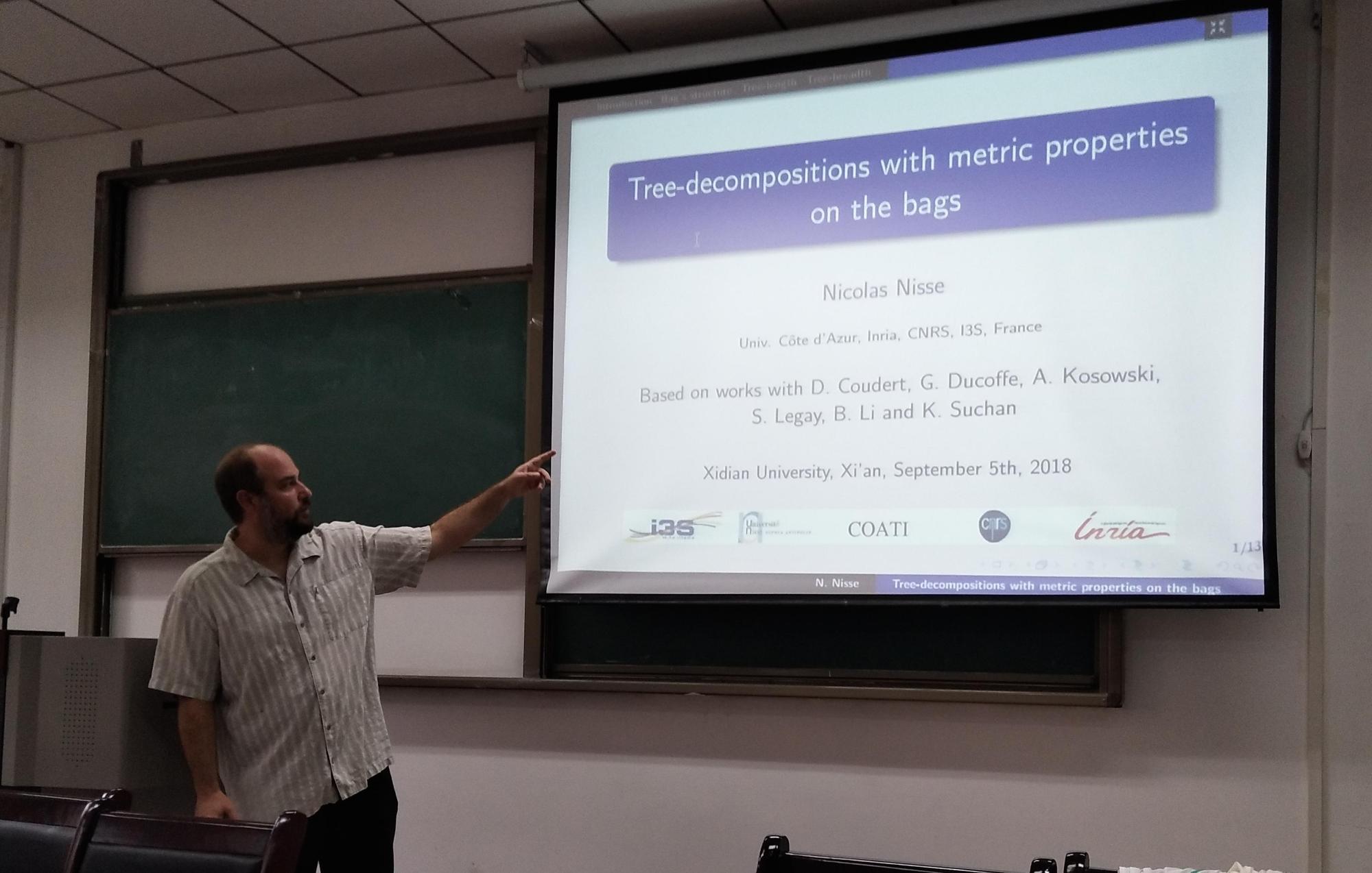 应太阳成集团(tyc1286·China)官方网站李碧博士邀请,法国信息与自动化研究所(Inria) Nicolas NISSE教授于2018年9月2日-15日来我校交流访问,与我校相关师生进行了亲切友好的座谈。并分别于9月5日和12日作题为“Tree decompositions with metric properties on bags”和“Recovery of disrupted airline operations using k-Maximum Matching in graphs”的学术报告,报告会在信远楼II区206会议室举行,报告会由李碧博士主持,共30多名师生参加了报告会。