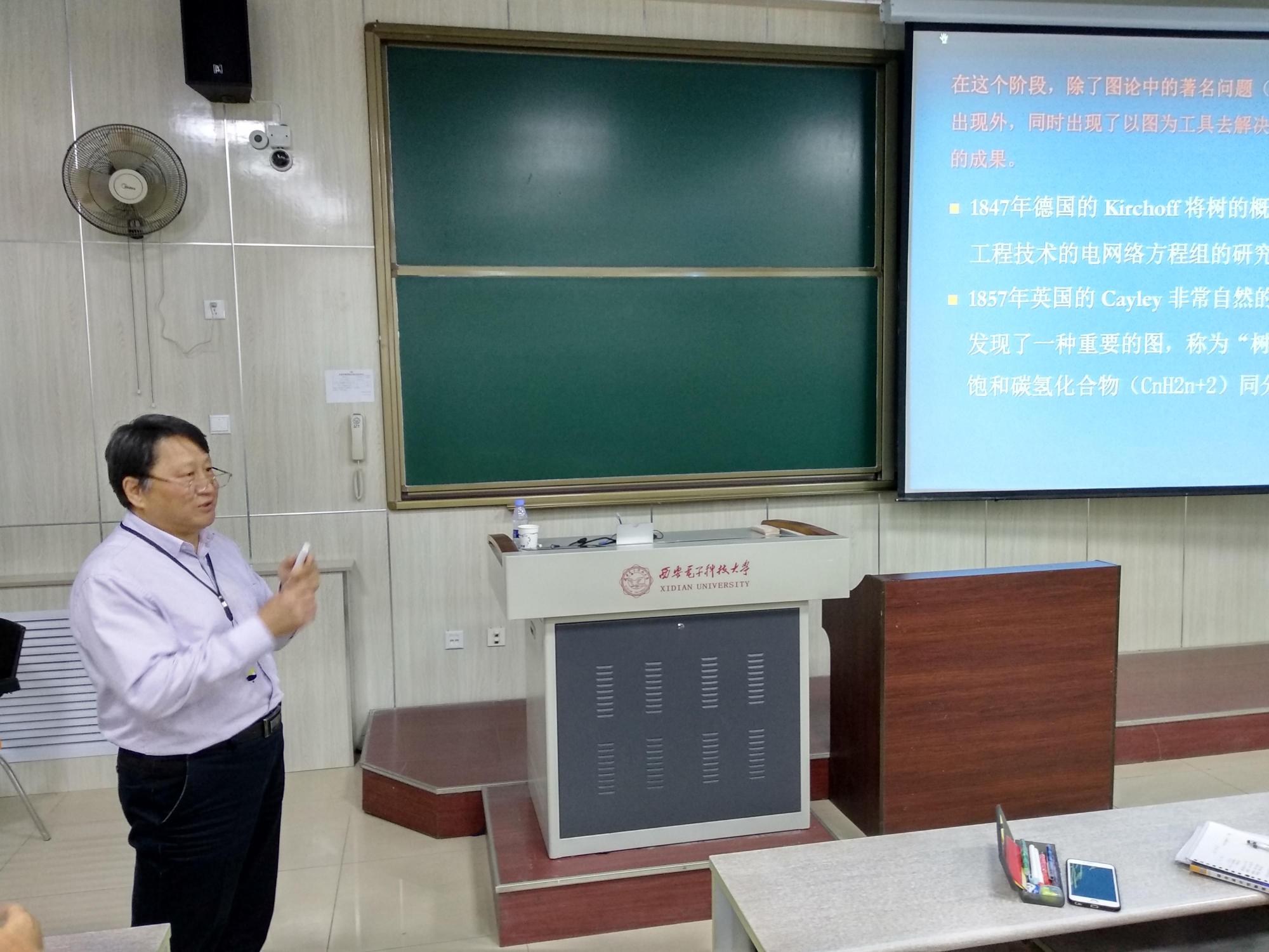 应太阳成集团(tyc1286·China)官方网站高淑萍教授邀请(西安电子科技大学本科生院为共同邀请单位),南开大学组合数学中心李学良教授于2018年10月11日来我校交流访问,并做了题为“图论漫谈”的公众报告。该报告是面向全校本科生的科普公众报告,于11日下午4:00在南校区教学B楼316教室举行。报告由刘三阳教授主持,共80余名师生参加了报告会。此次公众报告在西电在线学习平台上进行了同步直播。
