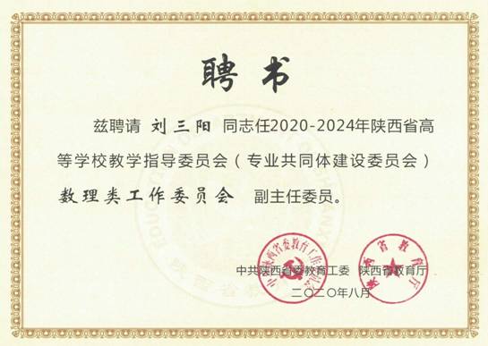 刘三阳教授是国家级教学名师、国家高层次人才特殊支持计划(“万人计划”)教学名师、教育部高等学校数学类专业教学指导委员会委员、教育部国家教材委员会专家委员会委员,此次担任我省数理类工作委员会副主任委员,定能对我校教学改革、人才培养、专业建设等工作起到推动作用,为我院教育教学、学科专业、教师发展和人才培养做出更大贡献。