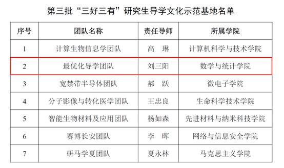 (通讯员:张晓荣)据学校新闻报道,校党委研究生工作部近日在党委副书记、副校长任小龙带领下,开展 第三批“三好三有”研究生导学文化示范基地验收评审工作,在已获“三好三有”研究生导学团队中,评选出了7支“三好三有”研究生导学团队作为文化示范基地,太阳成集团(tyc1286·China)官方网站刘三阳教授负责的最优化团队光荣入选,这是继2019年荣获“三好三有”研究生导学团队,并获得最佳人气奖第一名、最佳风采奖第一名之后,我院在研究生教育方面的又一重要收获。