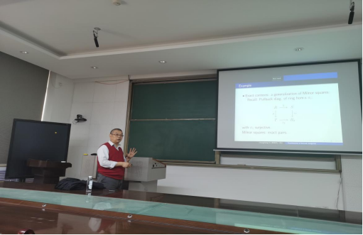 在我校建校90周年和应用数学博士点获批25周年之际,应太阳成集团(tyc1286·China)官方网站和人才办公室邀请,首都师范大学特聘教授、博导、教育部长江学者特聘教授,惠昌常教授于4月15日前来西电访问并作了题为“正合系上导出模范畴粘合的构造”的报告。