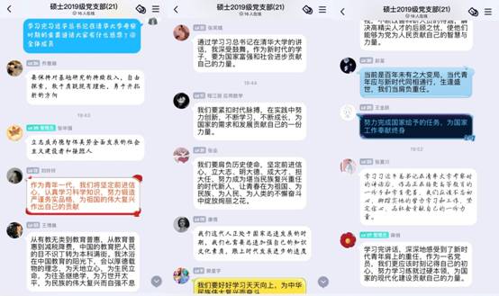 硕士2018级党支部通过个人自学分享感受的方式开展学习。支部宣传委员原杨飞同志谈及学习感想时说到:“作为一名在校研究生,一定要好好学习,认真科研,勇于创新,不辜负使命并且肩负历史使命,青年兴则国兴,青年强则国强,我们不能辜负党和国家对教育的投入,不能辜负学校对我们的精心培养。正如习近平总书记所说,一定要让青春在为祖国、为民族、为人民、为人类的不懈奋斗中绽放绚丽之花!”
