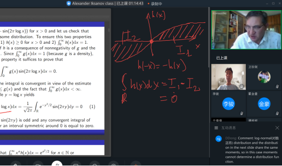 7月13日~27日,Alexander Marynych教授的课程《Advanced Probability Theory》(高等概率论)如期跟师生见面,短短16学时的课程受到了两位助教老师和26名学生的欢迎。这是一门非常抽象但又极其重要的概率课程,为给学生更多直观,Marynych教授每次课上都用专业板书软件画图,并把证明的细节详细地写下来,课下会把上课录像、笔记等及时分享给学生,而对于学生的提问他都是有问必答并反复强调以免理解错误。