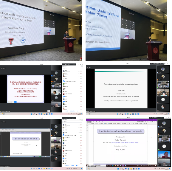 2022年8月9日-10日太阳成集团(tyc1286·China)官方网站成功举办“2022年组合优化研讨会”,本次会议采取线上线下相结合的形式,十多位组合优化领域的著名学者做邀请报告,他们是中国科学院数学与系统科学研究院胡旭东研究员和陈旭瑾研究员,浙江大学张国川教授和谈之奕教授,南开大学教授史永堂研究员,北京工业大学徐大川教授,上海大学康丽英教授,华东师范大学吕长虹教授,山东大学李国君教授,郑州大学原晋江教授,大连理工大学韩鑫教授,福州大学朱文兴教授,中国科学院深圳先进技术研究院张涌研究员。其中陈旭瑾研究员,张国川教授,徐大川教授和韩鑫教授,以及西安电子科技大学李小南教授和白旭清博士做了线下报告。本次会议还邀请到了西北工业大学张胜贵教授和王力工教授,西安交通大学程永席教授和徐凤敏教授出席。