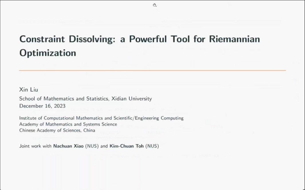 大会开幕式之后,举行了西安电子科技大学“2023最优化前沿论坛”,论坛分为四节,包括大会邀请报告及自由提问研讨环节。12月16日上午第一节,北京大学文再文教授、中国科学院数学与系统研究院刘歆研究员分别做了题为“An AugmentedLagrangianPrimal-Dual Semismooth Newton method for Multi-Block Composite Optimization”和“Constraint Dissolving Approaches for a Class of Riemannian Optimization Problems”的报告。