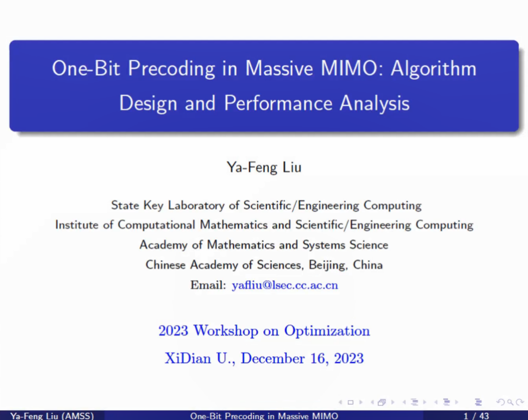 第二节,南京大学杨俊锋教授、中国科学院数学与系统研究院刘亚锋副研究员分别做了题为“A Primal-Dual Algorithm with Convex Combination for General Convex-Concave Saddle Point Problems”和“One-Bit Precoding in Massive MIMO: Algorithm Design and Performance Analysis”的报告。