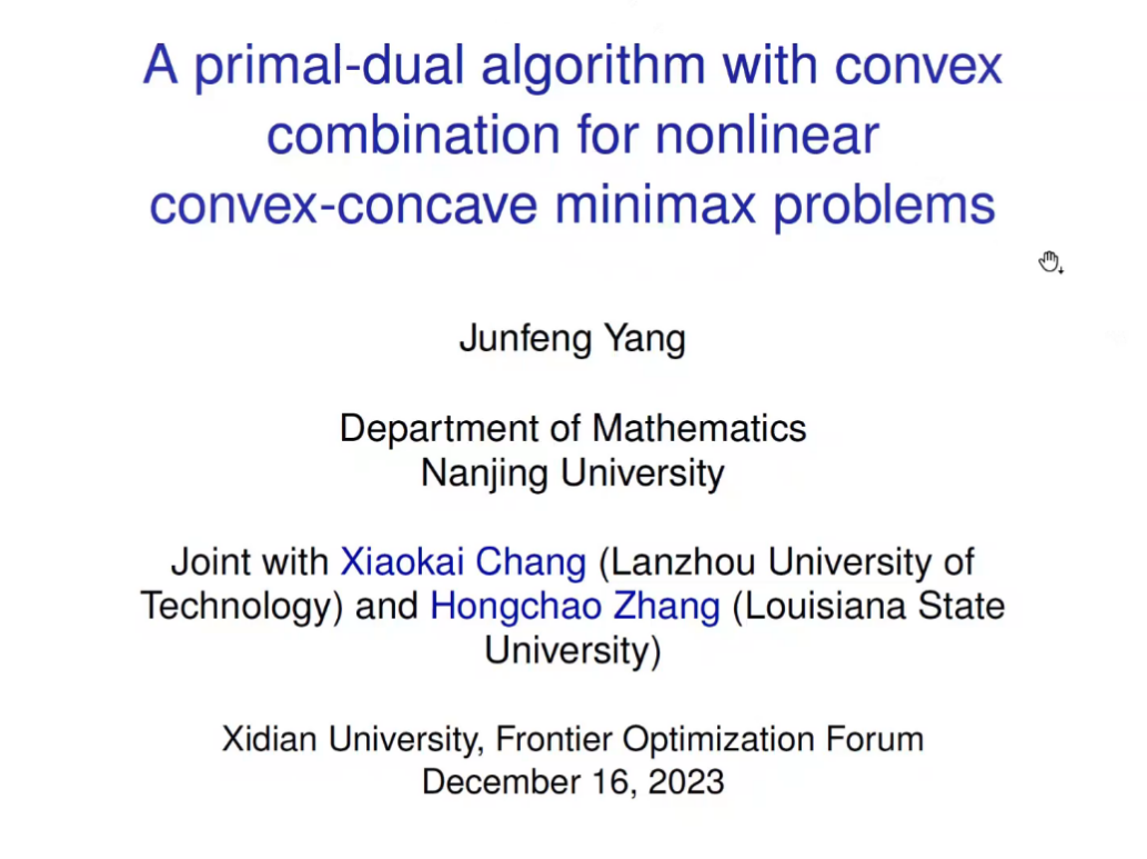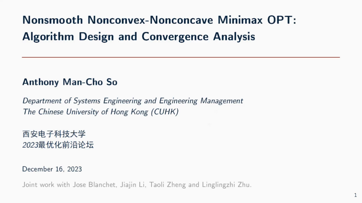(通讯员赵志华)2023年12月16日,西安电子科技大学举行“2023最优化前沿论坛”线上会议(腾讯会议:212-374-342)。会议得到了中国科学院数学与系统科学研究院、北京大学、香港中文大学、南京大学、南方科技大学和深圳大学等单位的大力支持。来自包括香港地区在内的全国各省市地区兄弟院校100名代表参加了此次会议。