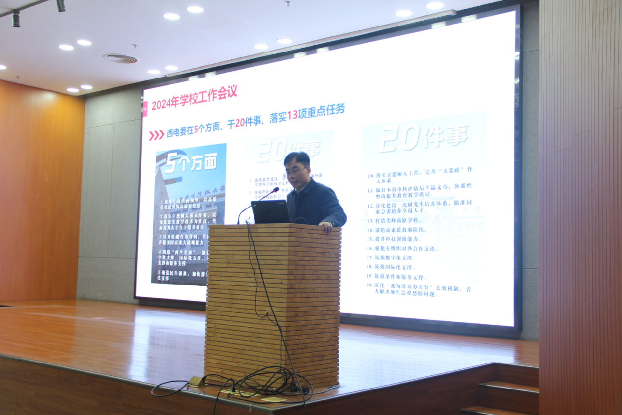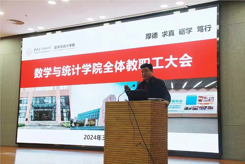执行院长薄立军代表学院领导班子传达学校工作会议精神并就我院的中心工作进行了全面动员部署。他指出,2024年是我校聚焦一个“时代课题”,深化落实“两个全面”主线,全力推进“三个年”建设的高质量发展之年,学校计划从5个方面干20件事情着力完成13项重点任务,而在这13项任务中间,力争数学学科进入ESI全球排名前1%、新增国字号人才、推进名师名课名教材一体化、保持自然科学基金质量和数量,也是我院今年工作推进的核心指标。他强调,面对新形势、新机遇、新任务,希望大家齐心协力、务实苦干、锐意创新,共同开启数统院高质量发展的新篇章。