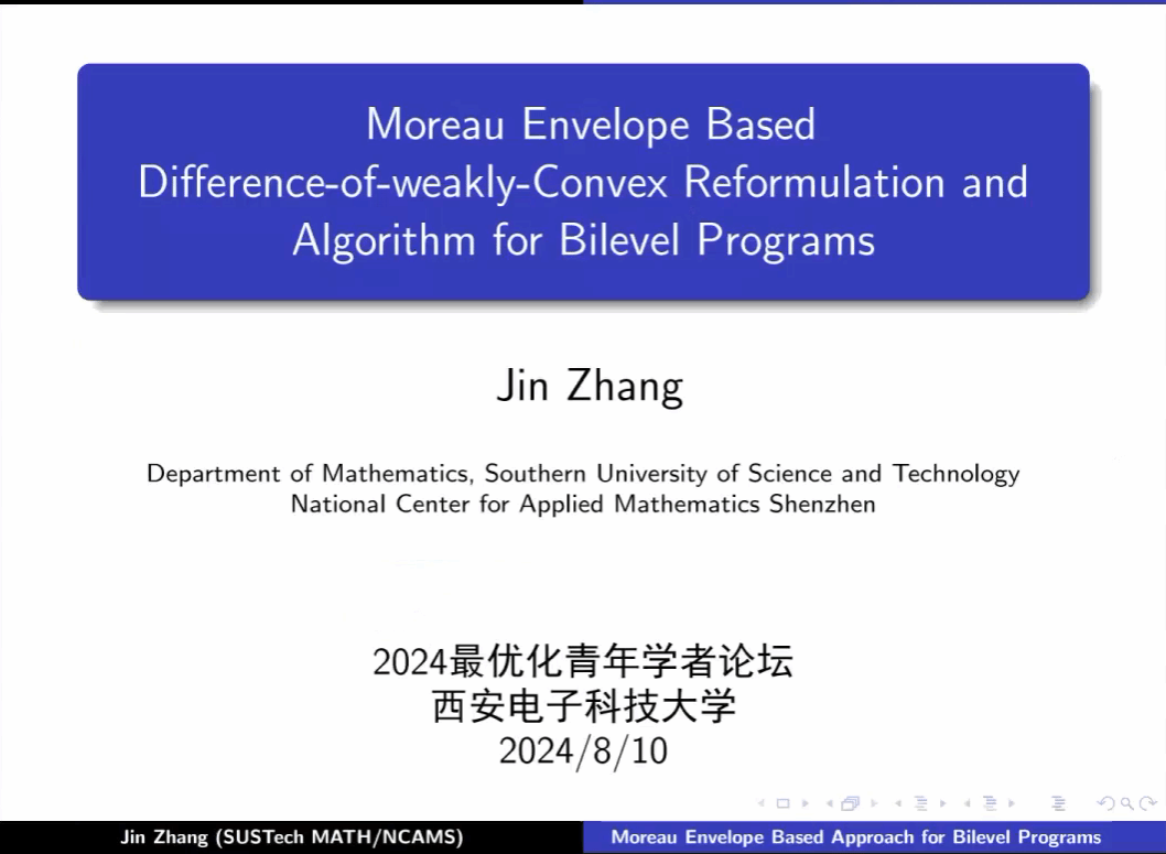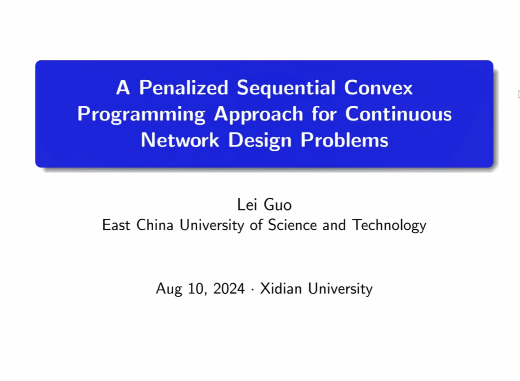 第二节,南方科技大学张进副教授、华东理工大学郭磊副教授分别做了题为“Moreau Envelope Based Difference-of-weakly-Convex Reformulation and Algorithm for Bilevel Programs”和“A Penalized Sequential Convex Programming Approach for Continuous Network Design Problems” 的报告。