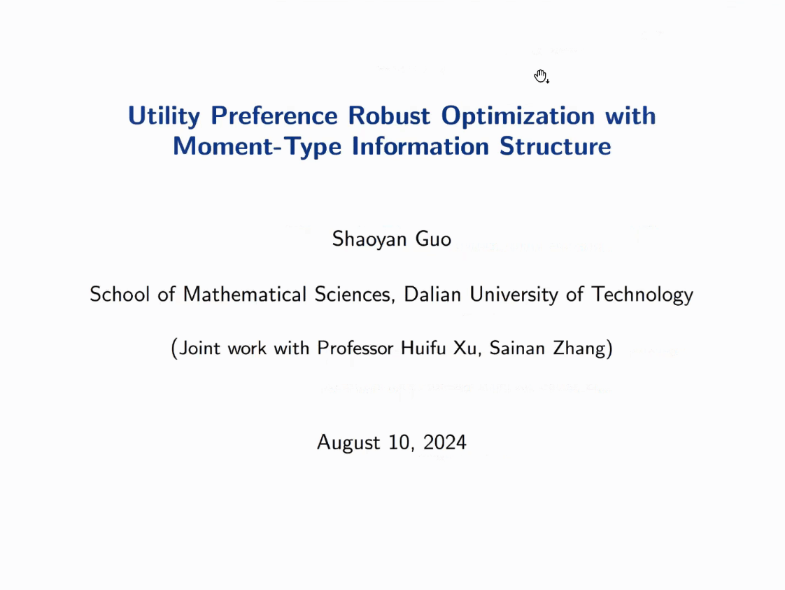 第四节,大连理工大学郭少艳副教授、湖南大学陈亮副教授分别做了题为“Utility Preference Robust Optimization with Moment-Type Information Structure” 和 “A Highly Efficient Second-Order Cone Programming Approach for Dynamic Optimal Transport Problems on Staggered Grid Discretization” 的报告。