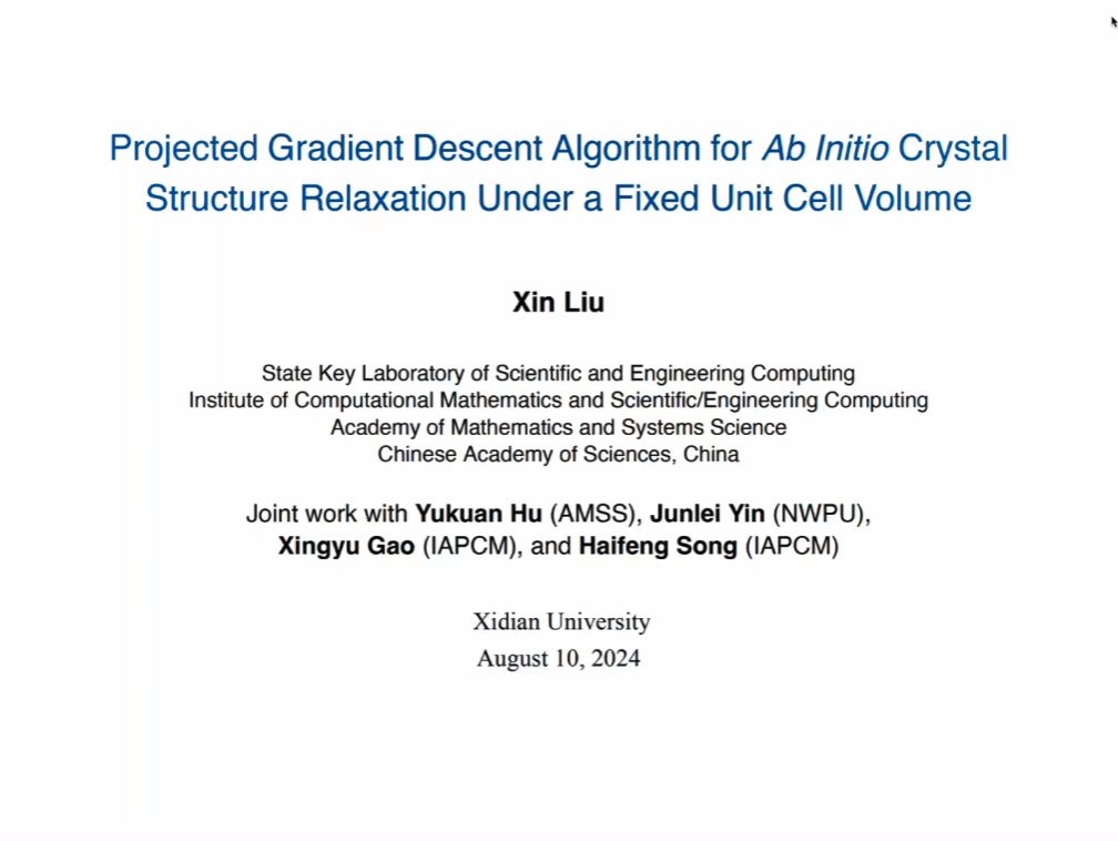 论坛分为四节,包括大会邀请报告及自由提问研讨环节。8月10日上午第一节,中国科学院刘歆研究员、哈尔滨工业大学边伟教授分别做了题为“Projected Gradient Descent Algorithm for AB Initio Crystal Structure Relaxation Under a Fixed Unit Cell Volume” 和 “Nonsmooth Convex-Concave Saddle Point Problems with Cardinality Penalties” 的报告。