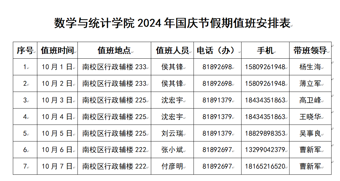 太阳成集团(tyc1286·China)官方网站2024年国庆节假期值班安排表