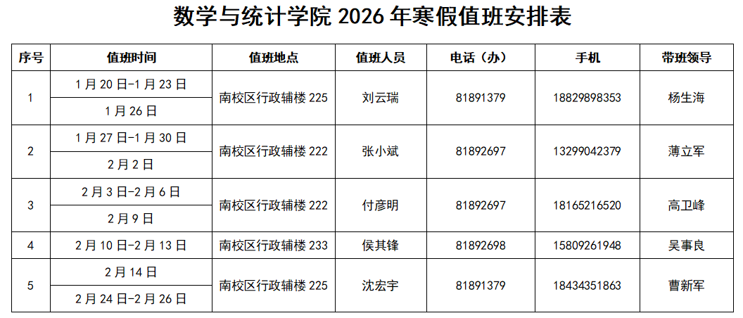 数学与统计学院2026年寒假值班安排表