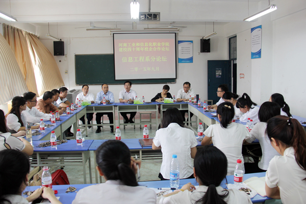 心系母校,相约工信。9月19日下午,我院建校四十周年校企合作论坛•信息工程系分论坛——专业建设专题研讨会如期举行。院领导邱雨生、中兴通讯公司执行副总裁樊庆峰、信息工程系主要领导和系全体专职教师参加了专题研讨。