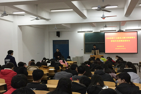 为大力弘扬和倡导遵纪守法、见义勇为的良好风尚,全面提升广大学生的社会主义核心价值观,12月22日下午,财经商贸系在2105教室举行了“河南省第十三届见义勇为英雄模范候选人贾昭天先进事迹”报告会。全系近200名同学聆听了报告,报告会由系副主任李志远主持。