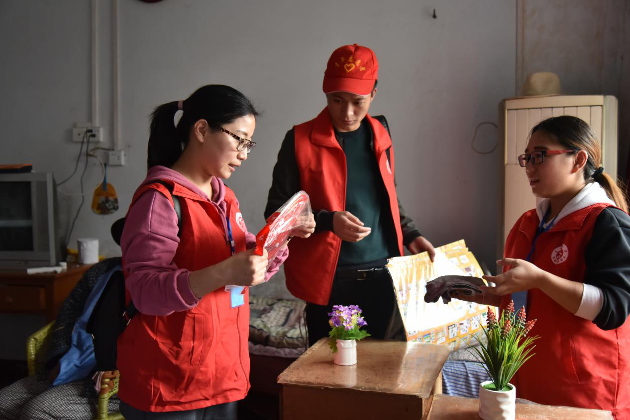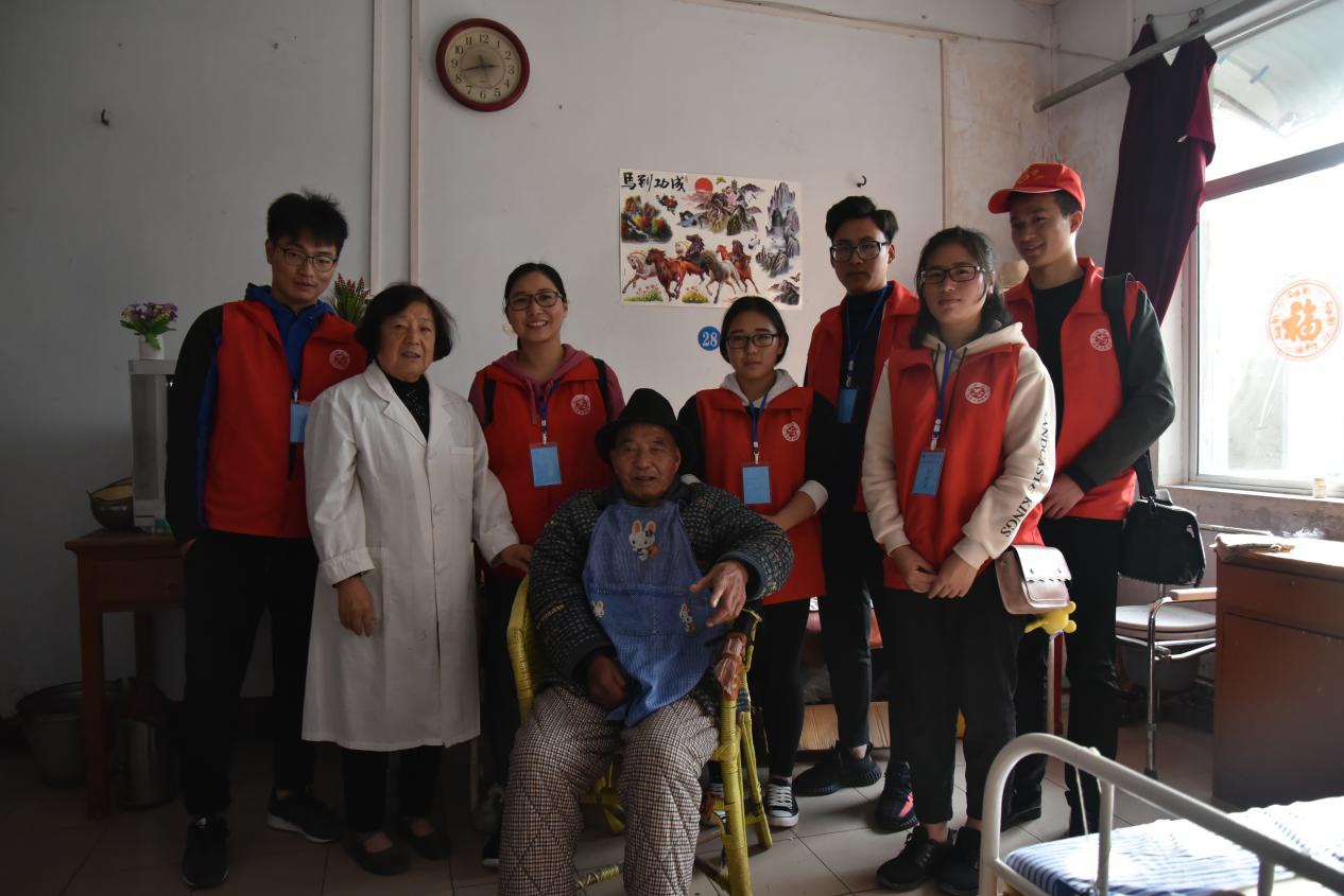 志愿者们和老人合影
