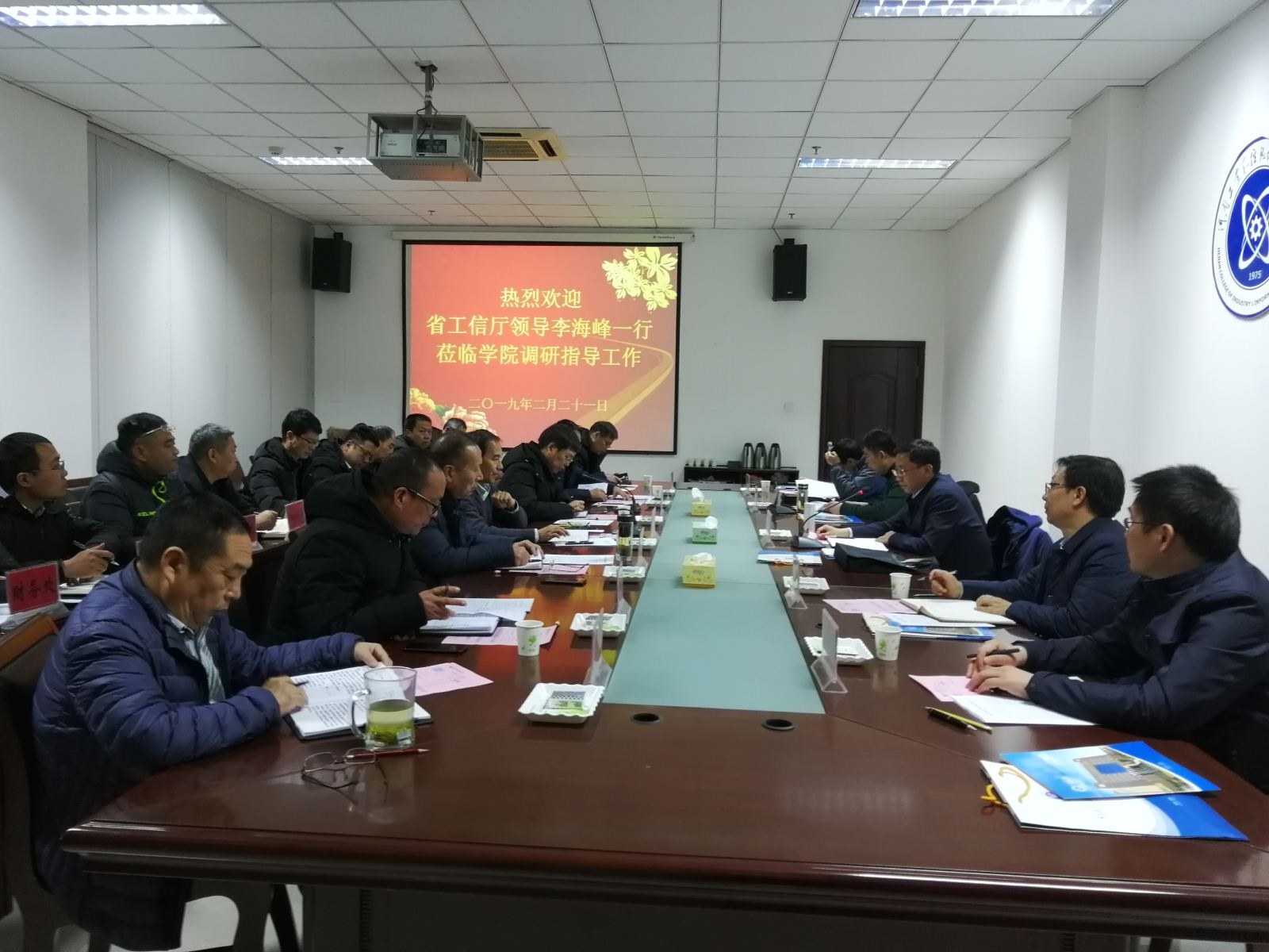2月21日,省工业和信息化厅副巡视员李海峰、财务处调研员李宏业、人事教育处副处长胡建清等一行莅临我院,就当前学院发展中存在的困难和问题以及关于整合厅属学校教育资源聚力人才培养问题等进行调研。学院领导张树岭、陈荣邦、吕况、魏道清、张红兵以及学院相关部门负责人参加座谈会。