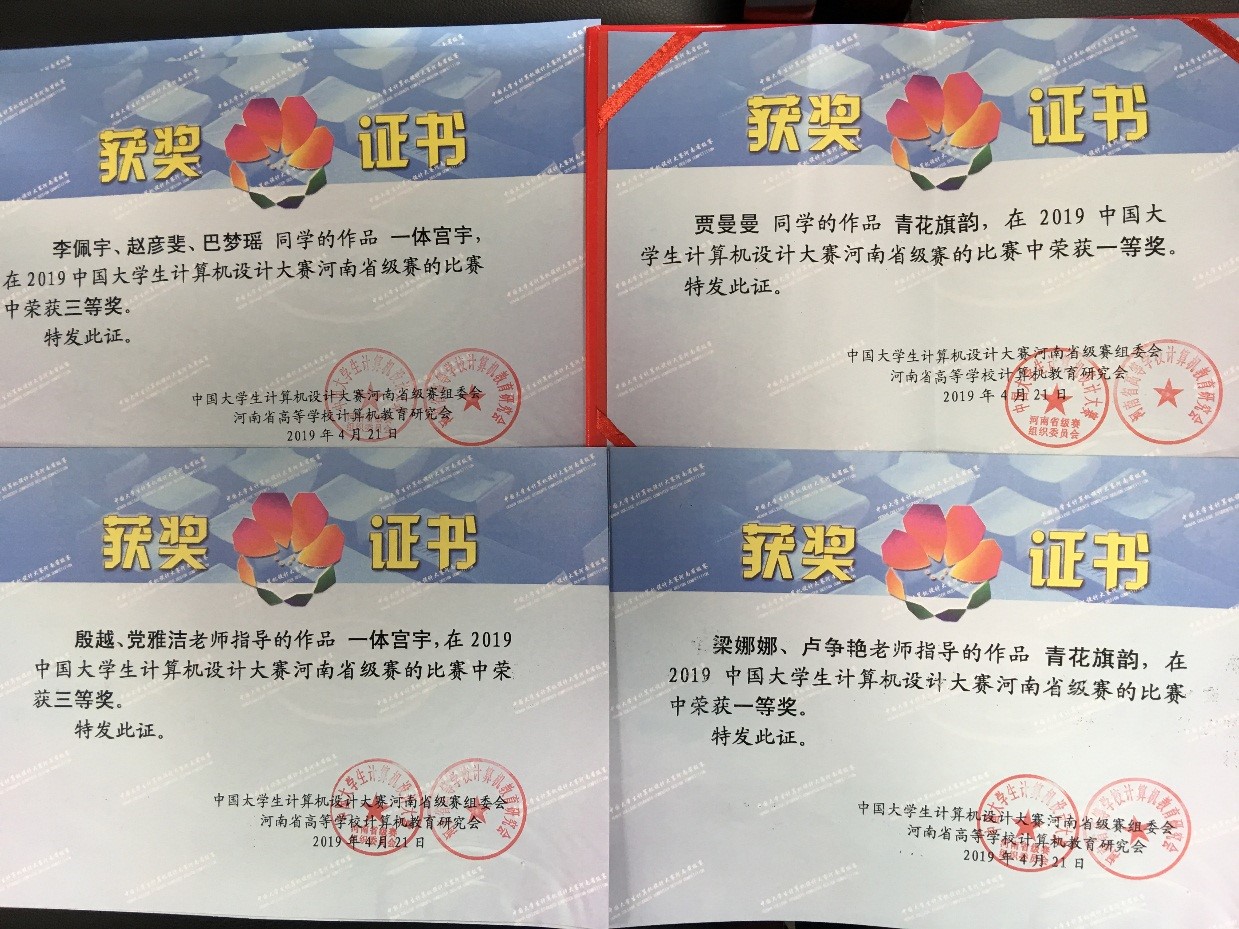 4月19日至21日, 2019年(第12届)中国大学生计算机设计大赛河南省级赛在华北水利水电大学隆重举行。我院信息工程系组队参加了本次比赛。经过作品初评、作品展示与答辩、专家复评等多个环节的紧张角逐,我院参赛的两件作品均获得奖项。其中,由梁娜娜和卢争艳两位老师指导的学生作品《青花旗韵》荣获一等奖,由党雅洁和殷越两位老师指导的学生作品《一体宫宇》荣获了三等奖。
