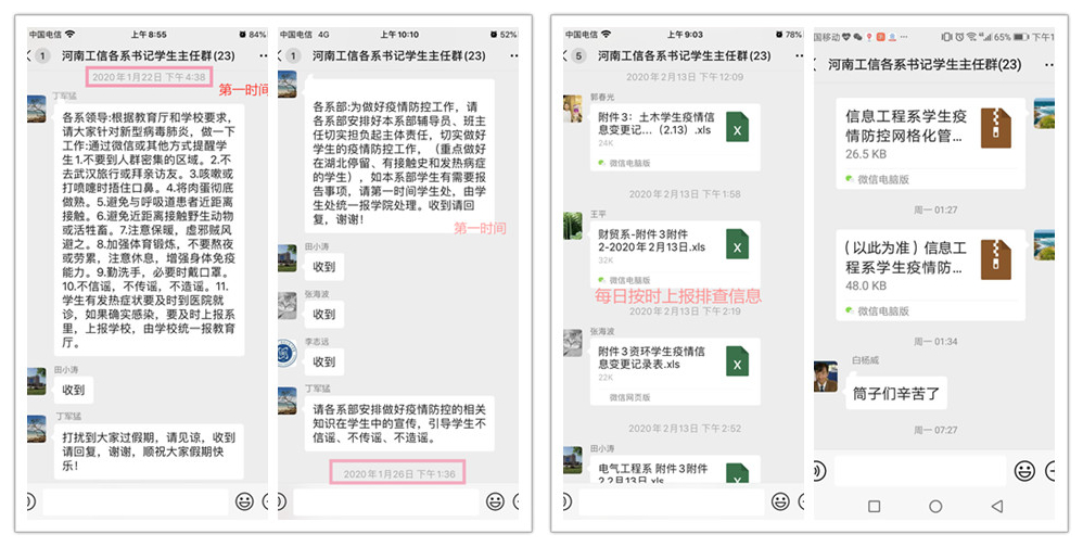 全力奋战一线,坚守岗位共克时艰。疫情防控期间,我院全体学工人员坚守岗位、奋战一线,在摸排中始终坚持以“第一时间”、“不漏一人”,全力做好学生动向摸排统计工作,动态掌握学生详细情况,及时准确上报各项数据。大家全天24小时处于战斗状态,并且克服了远程管理、居家办公等各种困难,常忙碌至深夜也无怨言。尤其是一线的班主任、辅导员们,他们在最紧要的关头,迎难而上,及时排解学生的心理困惑,筑牢疫情防控的安全防线。他们通过QQ群、微信群、电话、网络班会等渠道,耐心细致地向学生普及疫情防控知识。疫情无情人有情,一通通电话、一条条信息、一句句叮嘱,传达了浓厚的师生情谊,筑牢了广大工信学子的健康“防火墙”。