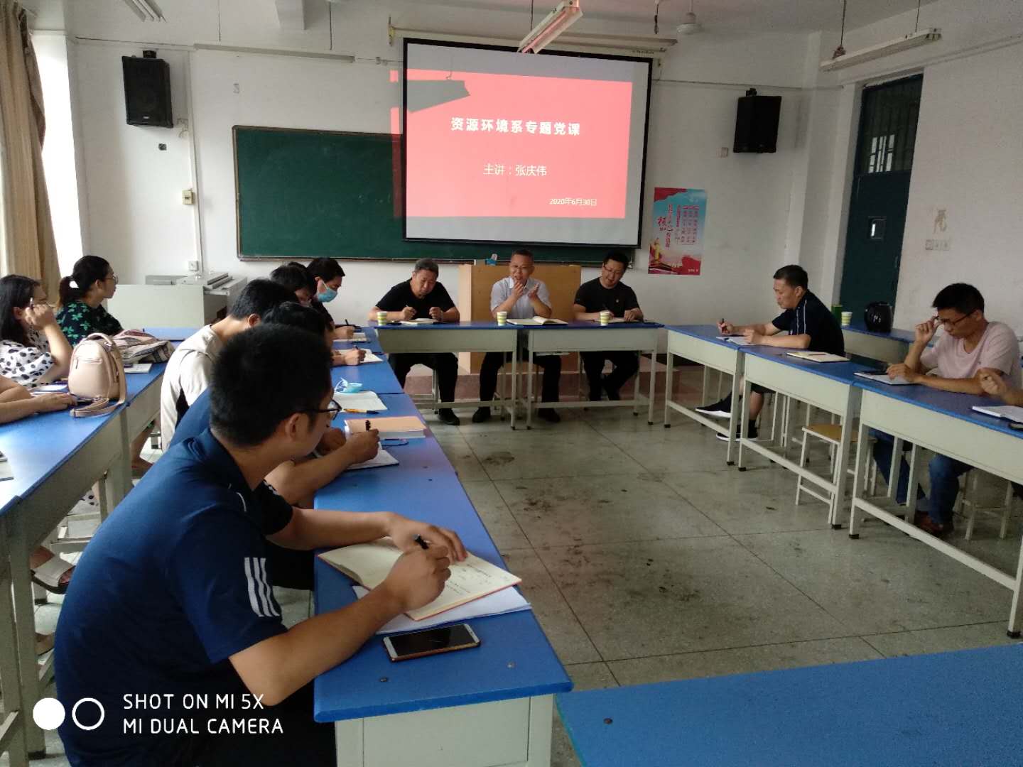 为庆祝中国共产党成立99周年,教育引导党员干部亮身份、践承诺、展风采,扎实巩固“不忘初心、牢记使命”主题教育成果,按照院党委《关于践行对党忠诚开展“七个一”活动的通知》要求,7月1日,副院长张庆伟以“担当做为,探索新的发展增长点”为主题为我院资源环境系全体党员教师上了一堂深刻、生动、精彩的专题党课。