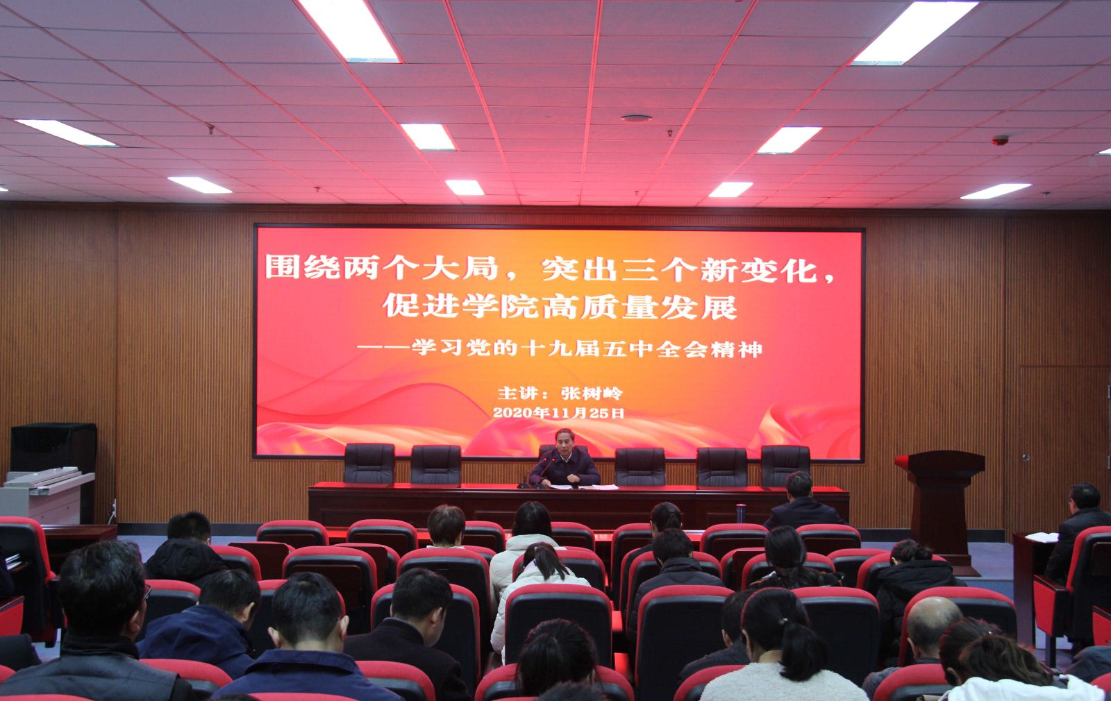 11月25日下午,学院党委书记张树岭以“围绕两个大局 突出三个新变化 促进学院高质量发展”为主题,作了学习贯彻党的十九届五中全会精神宣讲报告。报告会由党委副书记陈荣邦主持,全体中层以上干部聆听了此次报告。