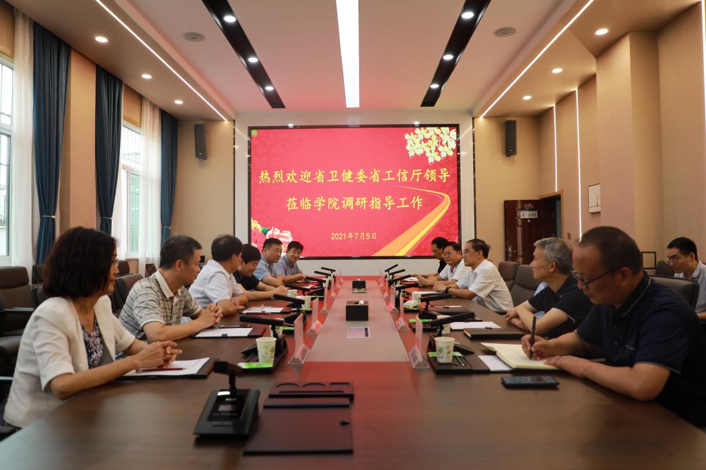 7月5日下午,河南省卫生健康委员会二级巡视员王金河、河南省工业和信息化厅二级巡视员樊二刚、河南省医药卫生学校校长李进旭、河南省工业和信息化厅政策法规处副处长刘立军等一行莅临学院调研指导工作。院党委书记张树岭、院长焦洪涛、副院长毋虎城、纪委书记盛兴文、党委委员魏道清、张红兵参加了调研工作座谈会。
