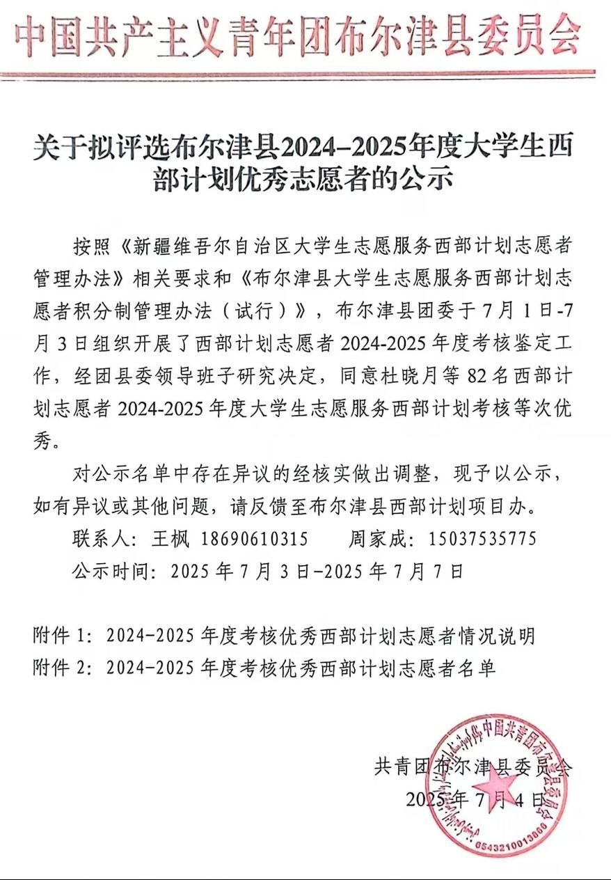 近日,新疆维吾尔自治区布尔津县发布2024-2025年度考核优秀西部计划志愿者名单,我校智能制造学院2024届优秀毕业生邓缘旭因在西部计划服务期间表现突出,荣获全国项目办认定的县直优秀志愿者,展现了新时代青年扎根基层、奉献祖国的责任担当。