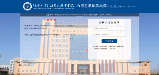 1.首先用电脑登录我校单招系统(网址:http://ddzs.hciit.edu.cn/),输入本人身份证号和考生后六位登录系统。