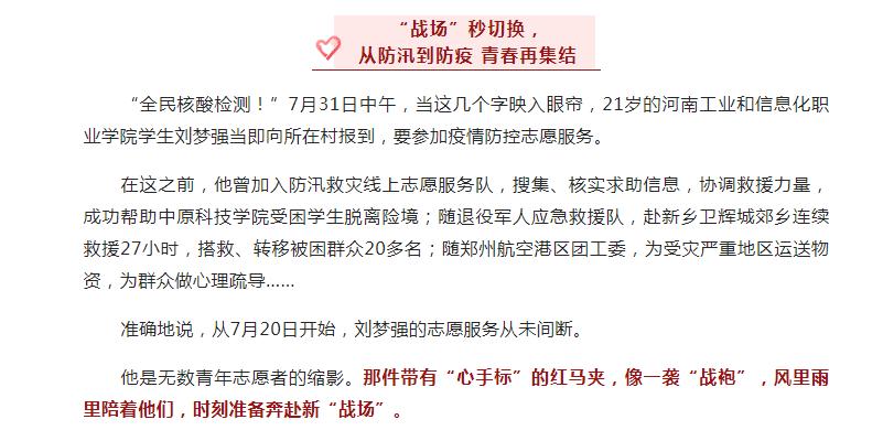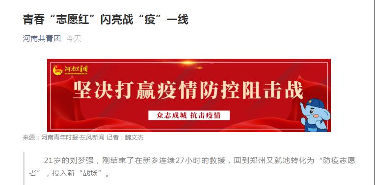 8月10日“河南共青团”微信公众号以《青春“志愿红”闪亮战“疫”一线”》为题转载了来自《河南青年时报》的新闻报道,新闻记者魏文杰采写报道了我院软件19-1班刘梦强参加防汛抗疫志愿服务的先进事迹。