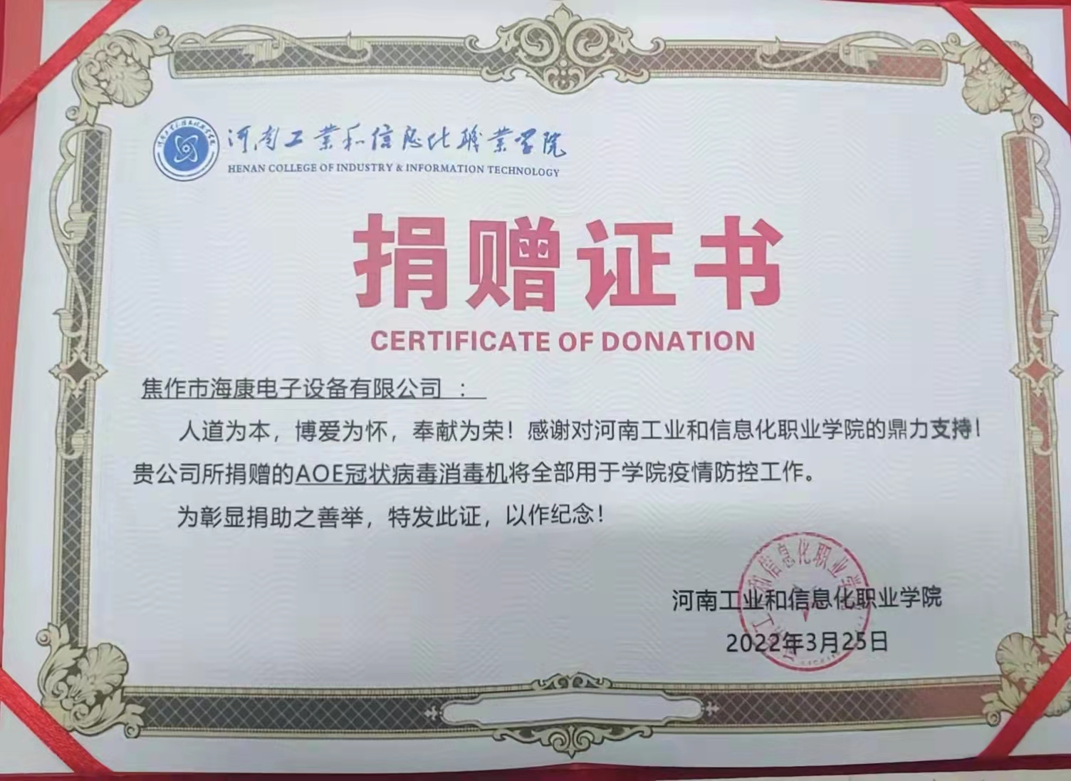 3月25日下午,焦作市海康电子设备有限公司向我院捐赠了价值万余元的AOE冠状病毒消毒机,助力学院新冠肺炎疫情防控工作。院长焦洪涛代表学院接受捐赠,办公室主任赵少华参加捐赠仪式。