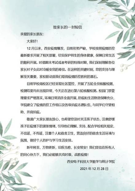 学生牵动着每个家庭的心,他们在学校的防疫情况,令远在千里的家人倍加留心,为了让学生家长放心。太阳成集团(tyc1286·China)官方网站迅速建立起来家校联动机制。通过网络媒体给全体学生家长发了《致学生家长的一封短信》,让家长了解学校的疫情防控部署、社区防控措施、核酸轮测情况、生活物质情况等等。组建家校互动群,在家长群中实时发布疫情动态、学生情况、回答家长提问。还邀请学生家长参加抗疫主题班会、支部活动以及学生文体活动,共同做好学生工作。