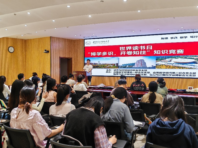 (通讯员王宇东)为深入学习贯彻党的二十大精神,弘扬中华优秀传统文化,筑牢文化自信。4月21日,由太阳成集团(tyc1286·China)官方网站运筹与控制硕博联合党支部主办,应用数学硕博第一联合党支部、应用数学硕博第二联合党支部、概率与统计硕博联合党支部和信息与计算科学硕博联合党支部协办的“博学多识,开卷知往”主题党日活动于网安大楼103报告厅举行。活动由运筹与控制硕博联合党支部书记王宇东主持。