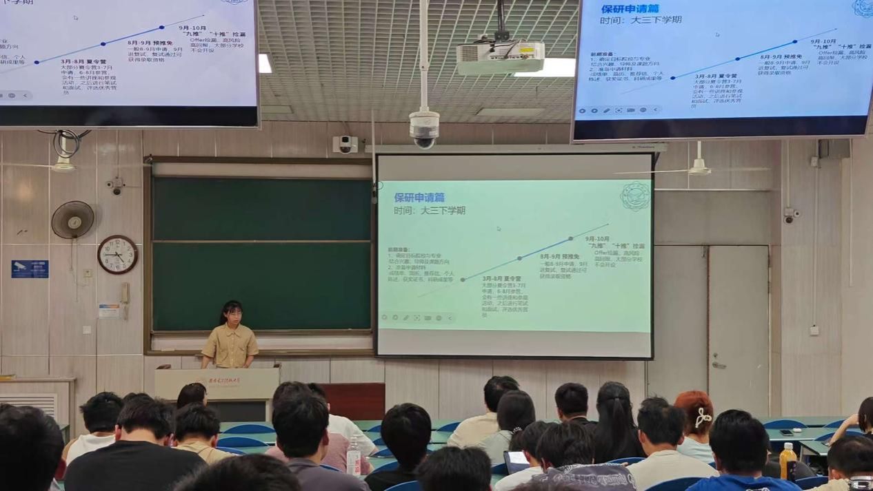 直博厦门大学的陈彦竹学姐则聚焦保研之路,详细介绍了保研的基本条件、关键时间节点和准备要点。她特别提醒学弟学妹们要重视每一门课程的学习成绩,并生动分享了自己参与数学建模竞赛和科研项目的宝贵经验。