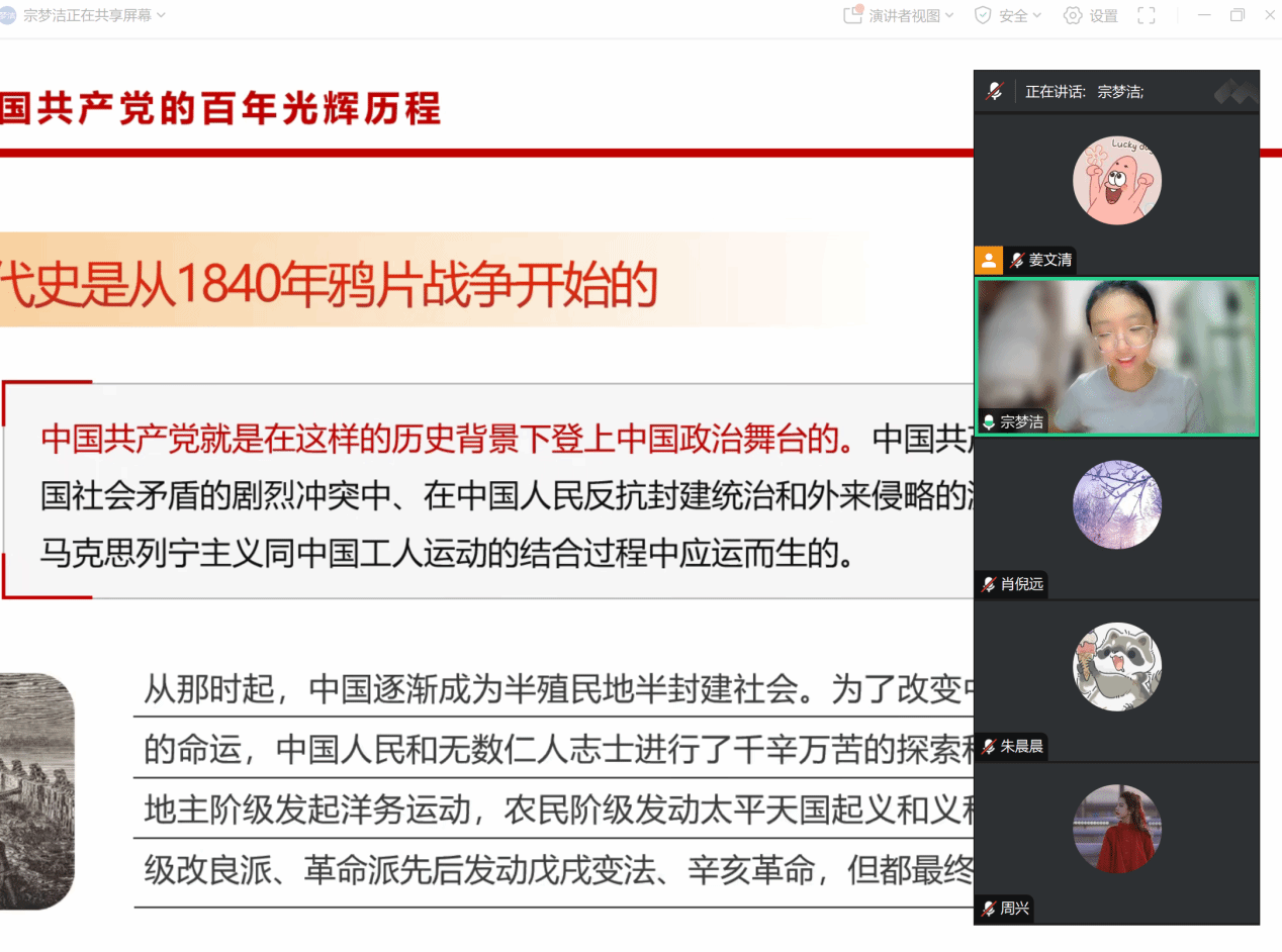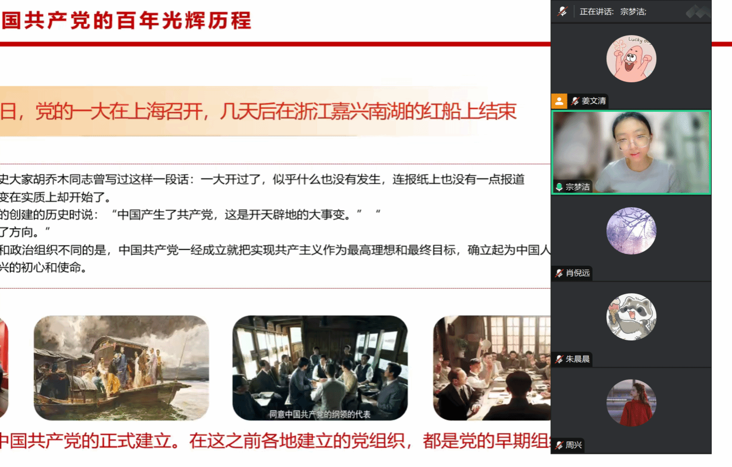 太阳成集团(tyc1286·China)官方网站“时代之声”宣讲团成员宗梦洁以“学好百年党史,凝聚奋进力量”展开宣讲。她从为什么旧中国选择了中国共产党、中国共产党的革命艰辛的不易、中国共产党的成立带给中国的意义以及新时代中国共产党的历程这些方面展开宣讲。她讲到,作为新时代青年应该以党史为镜洗涤心灵尘埃,从百年征程中汲取奋进力量。既要在历史回望中重温初心、叩问初心,将红色基因融入血脉,以时代之问校准行动坐标,方能在时代答卷上写下无愧于党和人民的青春注脚,续写中华民族伟大复兴的崭新篇章。