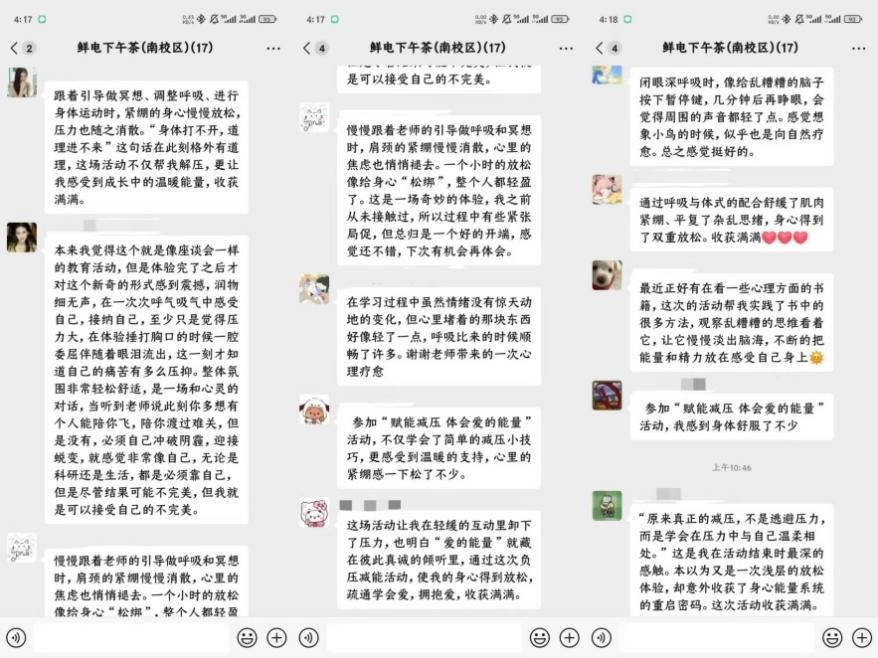 通过身体扫描和意象引导等专业方法,同学们学会了如何与自己的情绪共处,如何接纳不完美的自己。活动中,老师引导大家想象小鸟飞翔的场景,借自然之力实现心灵疗愈,让参与学生在轻松舒适的氛围中完成了心灵减压。