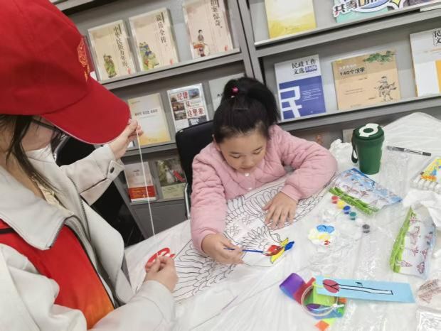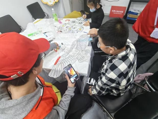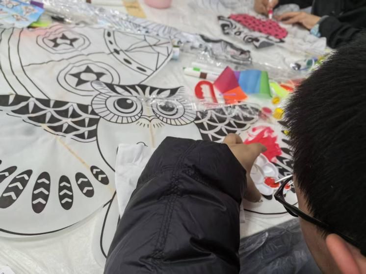 非遗纸风筝体验环节中,社区老师展示多彩样品,讲述蝙蝠“福寿双全”、鲤鱼跃龙门、双龙戏珠等风筝样式的历史与寓意,分享潍坊风筝节的壮观场面。手工制作时,志愿者协助孩子们剪裁、粘贴、绑线,一只只灵动的蝙蝠、蜻蜓、蝴蝶风筝相继诞生,孩子们满心欢喜期待放飞。