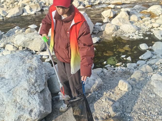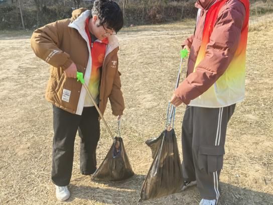 活动当日,虽时值深冬,圭峰山间寒意渐浓,但同学们的志愿服务热情丝毫未减。抵达目的地后,团队迅速分为两组,一组沿登山步道开展全域垃圾清捡,另一组聚焦山间河道及周边水域开展专项治理。清捡组的同学们手持环保夹子、拎着分类垃圾袋,弯腰穿梭在步道两侧的草丛、石阶缝隙中,细致捡拾游客遗留的塑料瓶、食品包装袋、废旧口罩等各类生活垃圾,同时对可回收物与其他垃圾进行分类收纳,避免二次污染。