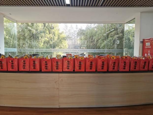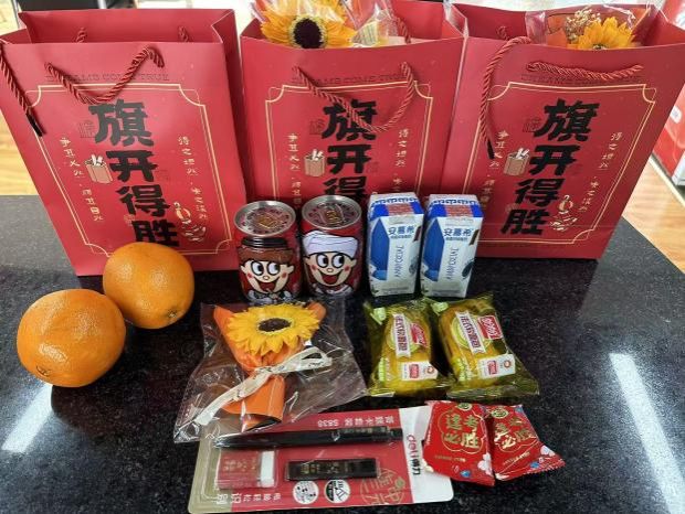 活动现场,领导老师们逐一为学子递上精心筹备的“考研加油包”,每一份礼包都承载着学院的细致考量与真挚祝福。礼包中,寓意“心想事成”的新鲜橙子饱满多汁,象征“考运旺旺”的旺仔牛奶元气满满,“所得所盼”的盼盼面包能及时补充备考能量,印有“逢考必胜”字样的棉花糖则为紧张的冲刺时光添了一抹甜意。今年的礼包更添一份暖心惊喜,一束束盛放的向日葵昂首向阳,寓意“向阳而生,前程似锦”,象征学子们在备考路上始终心怀热爱、坚定方向,希望这抹亮色能驱散备考的疲惫,为逐梦之路注入温暖力量。
