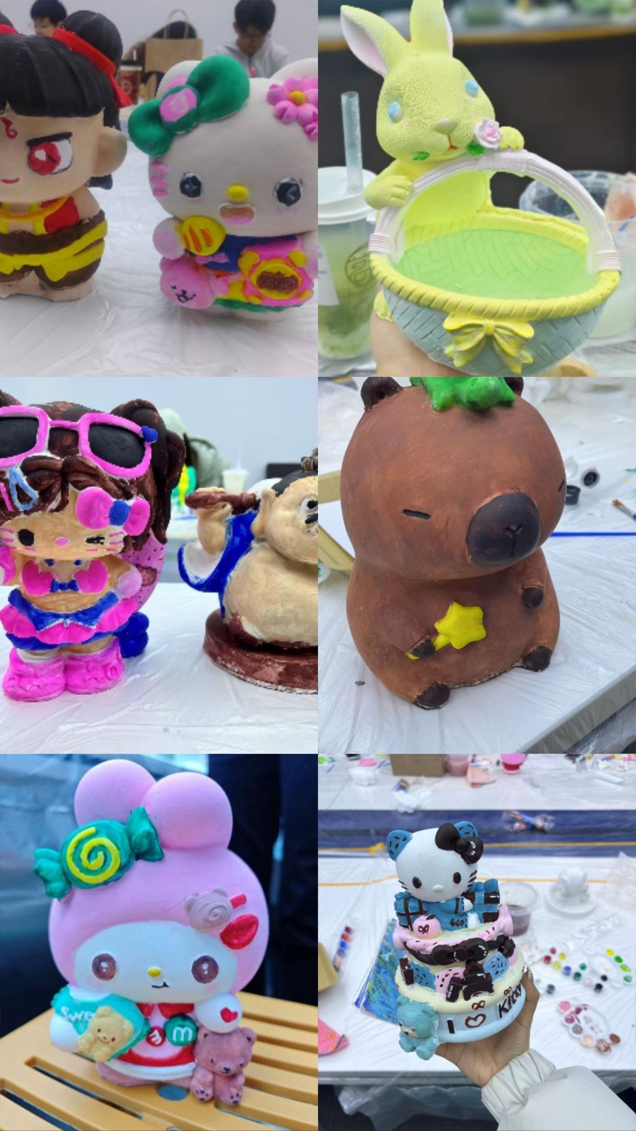 石膏娃娃涂鸦区洋溢着活泼生动的创作氛围。同学们挑选心仪的卡通造型,调色绘彩、细心涂抹,为素白石膏注入个性与生机。李婷婷一边绘制手中的娃娃,一边笑着说:“好像回到了小时候,专注涂色的过程特别解压。”大家互相交流配色心得、分享创作巧思,在笑语盈盈中完成了一件件独一无二的作品。短短两小时,一个个色彩斑斓、风格各异的石膏娃娃陆续诞生,成为同学们手中可触摸的童心纪念。