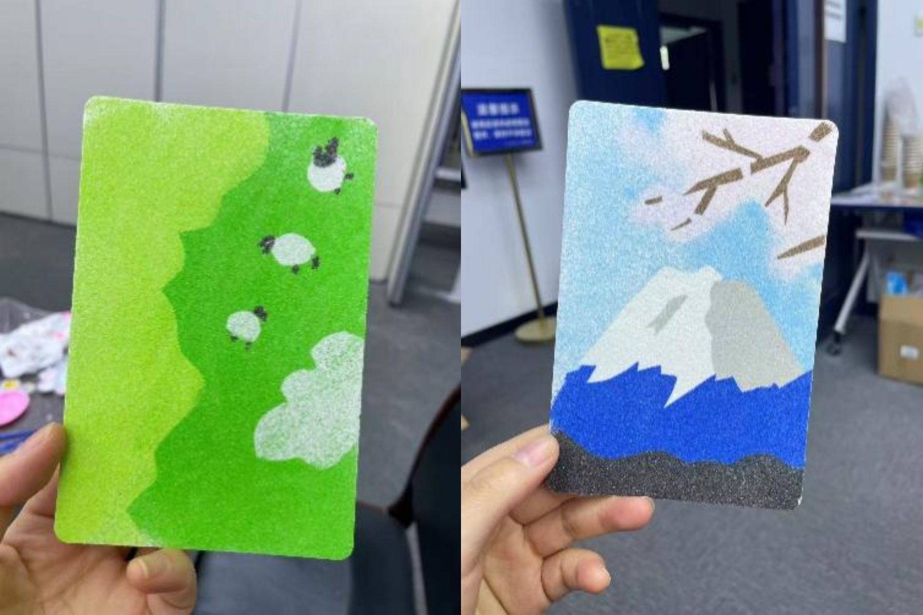 沙画体验区内,同学们以细腻彩沙为媒介,在光洁的沙画纸上铺洒、勾勒、点染,自由组合出各种图案。从远山层云、湖光树影的简约风景,到灵动可爱、憨态可掬的卡通形象,不同色彩与纹理在指尖流转中渐渐成形。现场氛围轻松愉快,创作中,沙的流动性赋予作品独特的呼吸感与即兴之美。“动手堆沙、抹平的过程让人很专注,也能静下心来。”参与学生高静怡分享道。沙画不仅是一门视觉艺术,更成为一种动态的冥想方式,让参与者在专注中舒缓压力,于流动的创作中收获一片宁静而愉悦的心灵角落。