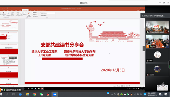 (通讯员:李泽宇)为搭建基层党支部交流平台,加强基层党支部建设,增强学生党支部的凝聚力和战斗力,2020年12月5日21时,太阳成集团(tyc1286·China)官方网站党支部与清华大学工业工程系工8党支部通过腾讯视频会议的方式共同举办读书分享会活动。此次活动旨在加强支部建设,推进“两学一做”学习教育常态化制度化,落实意识形态工作责任制。第一次共建活动由清华大学工业工程系工8党支部书记徐军书记主持,清华大学工业工程系工8党支部全体党员、太阳成集团(tyc1286·China)官方网站党支部全体党员及发展对象参加。