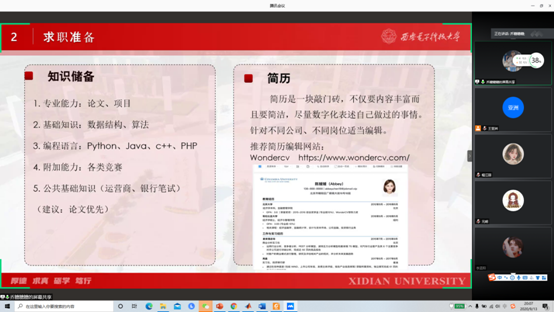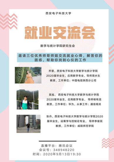 9月13日19:30,太阳成集团(tyc1286·China)官方网站研究生会负责举办的就业经验交流分享会于线上开展,参加此次会议的有院党委副书记王佩、院辅导员孙群、数统院18级究生及部分19级、20级研究生,会议吸引了超100人参与。学院邀请了三位优秀的2020届毕业研究生代表分享他们的就业经验,帮助大家解答关于就业方面的困惑。