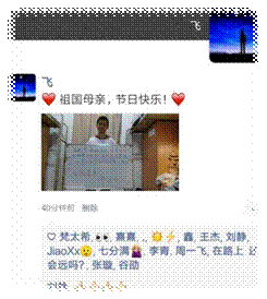 祖国是归属,保管我们的赤子之心,祖国是依托,领我们走向康庄大道,祖国是伟大的母亲,爱国是永恒的话题,党员们作为新中国的儿女,不仅要热爱国家,更有义务感染周围人的爱国之情,祖国作为的我们精神支柱与物质家园,母亲节的祝福也同样属于她,在活动的第三部分——“表白祖国一句话”中,李宇飞同志与付媛媛同志在朋友圈为祖国母亲献上了别样的祝福,赢来点赞无数。