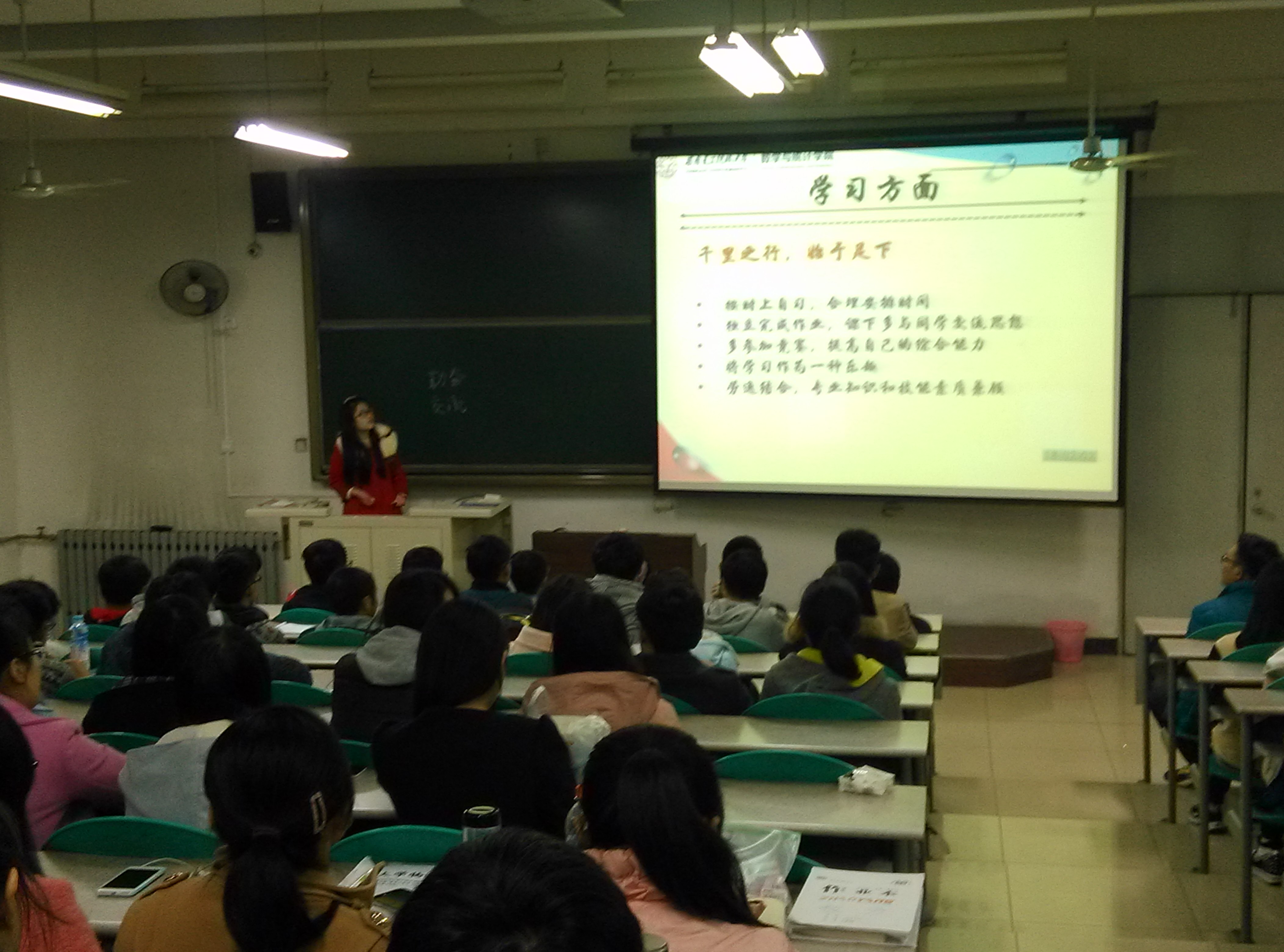 2015年11月15日晚6点30分,我院在教学楼B楼316室举办学习经验交流会,本次交流会由国家奖学金获得者、2012级统计学专业韩艺欣同学做主题交流,120余名同学参加了本次交流会。
